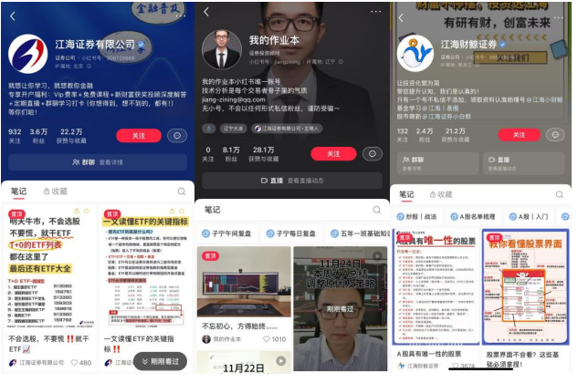 券商中国记者遏制到,面前不少券商已在小红书上积贮了不小的粉丝基础。举例,江海证券自2022年春季就入驻了小红书,当今粉丝数依然达到3.6万,获赞与保藏达22.2万。除了江海证券官方主账号除外,江海证券还孵化了多个矩阵号,举例以投资者耕动作主要内容的“江海财鲸证券”(粉丝数2.4万)、投顾号“我的功课本”(粉丝数8.1万)等。