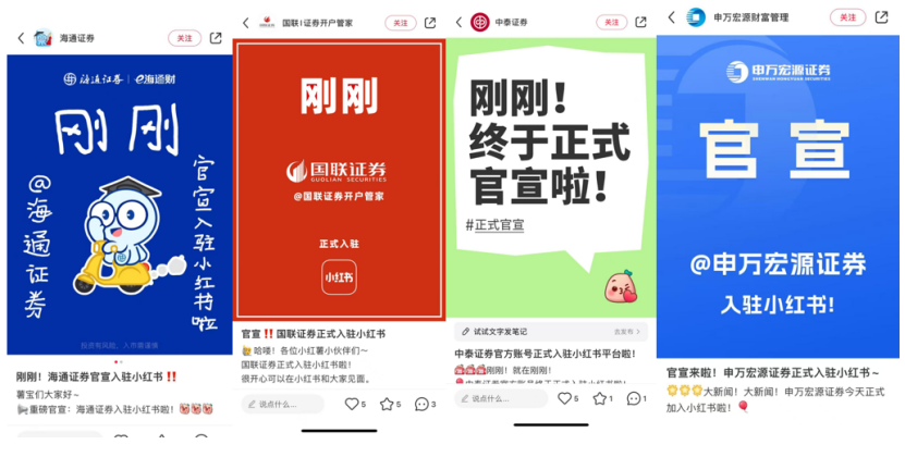 昔时一周,包括海通证券、中泰证券、国联证券、申万宏源证券等券商负责官宣入驻小红书。截止当今,负责入驻小红书的券商已达30余家,其中一些券商已积贮了数万粉丝。